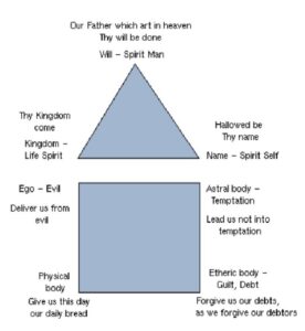 Steiner recoginized the human being as consisting of a lower physical nature and a higher spiritual nature. Generally, the latter is in the early stages of its evolution with very little conscious individual participation in its development. The diagram below is an illustration of our lower fourfold nature and our suggested higher threefold nature, and how this relates to the Lord’s prayer.