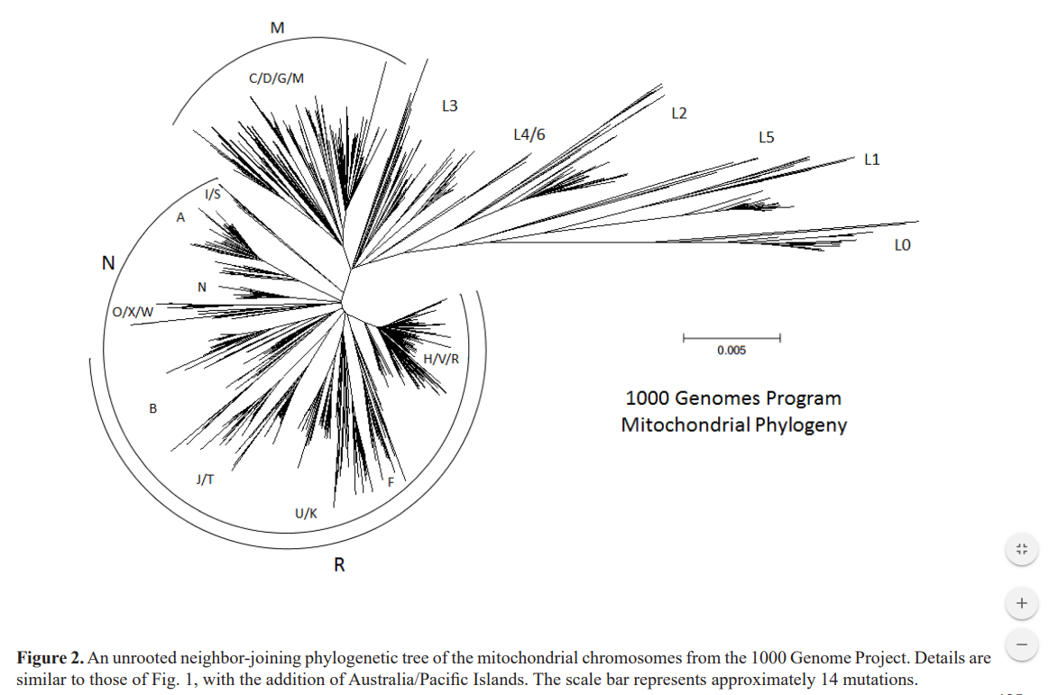 Carter argues the unrooted NJ Trees suggest a bottleneck. I agree with him. Yeah, unrooted trees aren’t supposed to imply what the common ancestor looked like, but to me, that’s about the best reconstruction possible. Carter at his talk said, “if 99% of the individuals on Earth have an A at one position and 1% a T, that suggests the common ancestor had an A.” That seems reasonable to me and hence justifies an interpretation of the unrooted tree the way Carter described it. He also argued some of the branches had reasonable traceable historical records associated with them such as the migration during the slave trade before the civil war, etc.