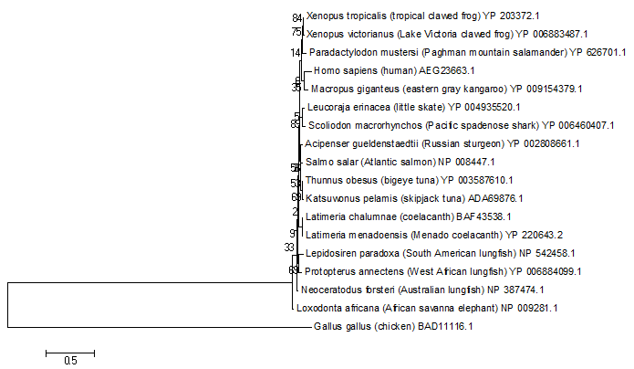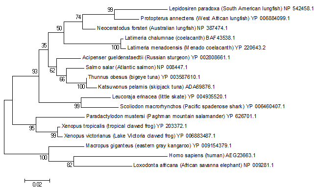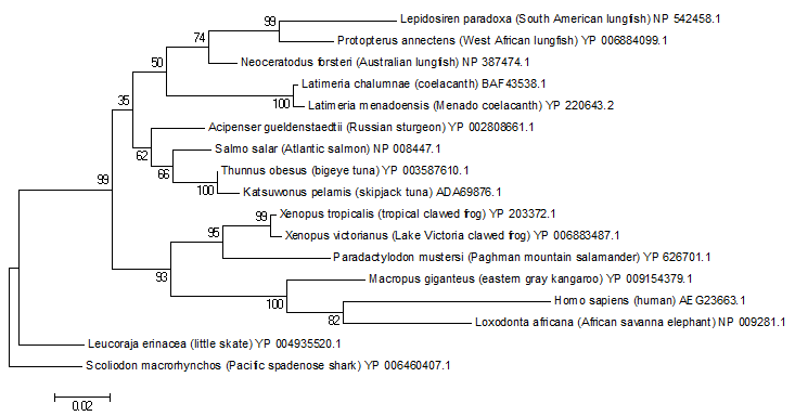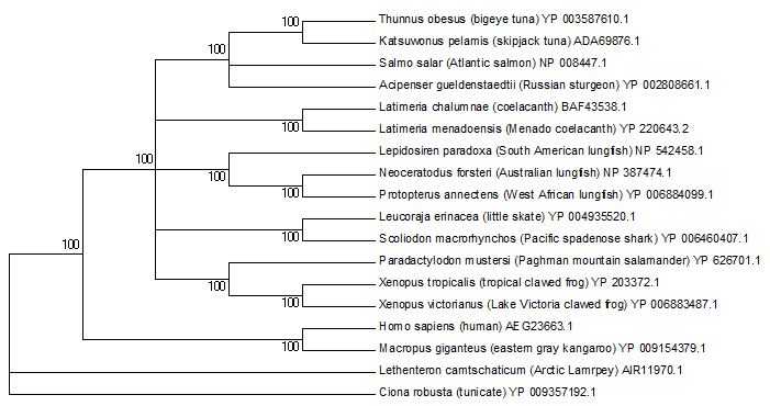 With respect to Cox1, with Nautilus as the out group it recovers approximately the Linnean hierarchy which puts tetrapods outside of the Sacropterygiian and Teleostomi clade. This is also nicely in accord with the constraints of the Jones-Taylor-Thornton distance matrices I linked to earlier.