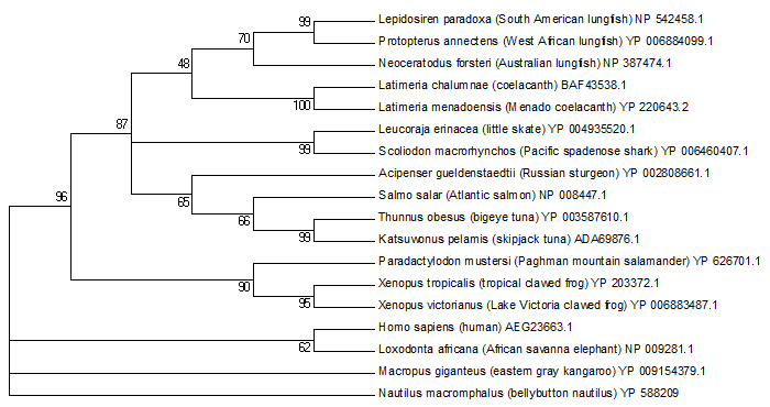 Below is the phylogenetic tree using Nautilus as outgroup. Nautilus is in the phylum molusca in contrast to every other animal represented in the phylum choradate. I guess next round I could try the chordate Tunicate which is not a vertebrate.