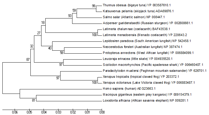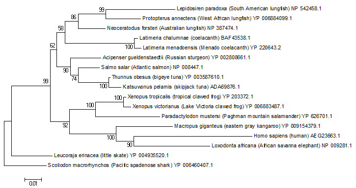 This is the Minimum Evolution phylogenetic tree, with shark as outgroup.