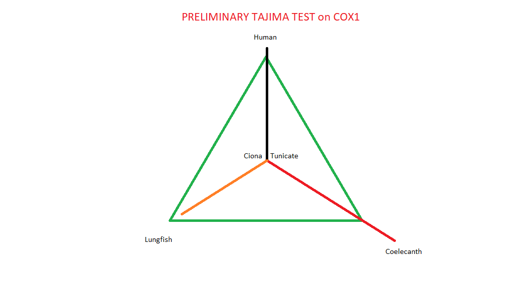 I have depicted in rough form the way I interpret the Tajima test, but one could also glean this from the JTT matrix, with slightly different lengths (the lungfish longer than the human in the JTT analysis). But the if these data points hold in general (which is yet to be seen) then that is evidence against the spirit of the Sarcopterygii clade being the ancestor of tetrapods.