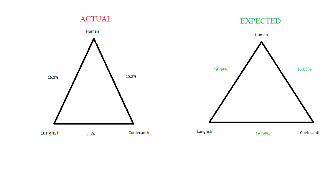 Below on the left (NOT TO SCALE) is a non-equilateral triangle where the lengths of each side are the measure of differences between the Cox1 proteins of human, coelacanth, and lungfish. That is the actual difference under the JTT metric, and as I said, it should be materially similar for any other reasonable metric.