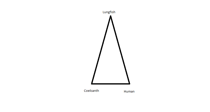 Because the Human and Coelcanth move so much faster than the Lunfish, qualitatively speaking the expected triangle might be something like the diagram below, although the JTT matrix suggest something more like a equilateral with human being the slowest.