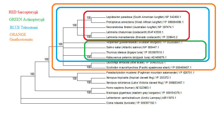 In contrast, a gene tree which I created with the Cox1 gene accords better with the idea Tuna and Lungfish are more similar than Lungfish and Pigeons. Now pigeon isn’t there in my graph, but many tetrapod sisters of the pigeon are there.