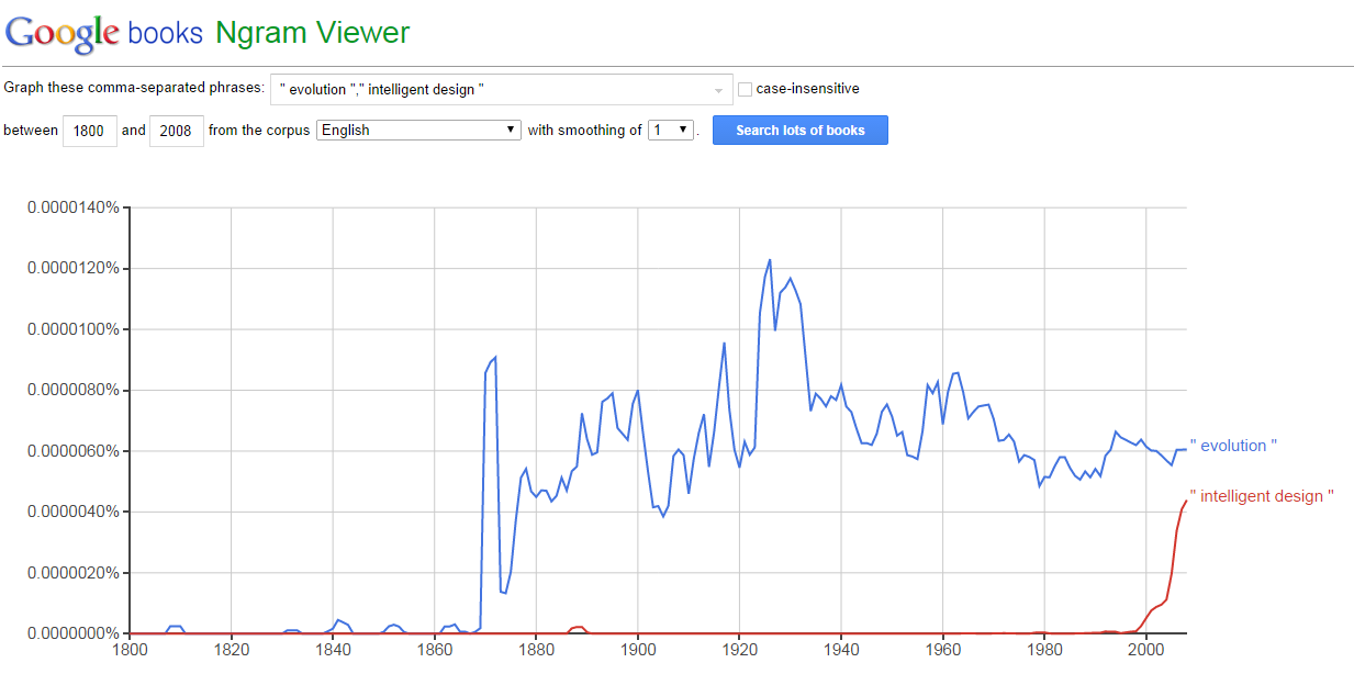 https://books.google.com/ngrams/graph?content=%22+evolution+%22%2C%22+intelligent+design+%22&year_start=1800&year_end=2000&corpus=15&smoothing=3&share=&direct_url=t1%3B%2C%22%20evolution%20%22%3B%2Cc0%3B.t1%3B%2C%22%20intelligent%20design%20%22%3B%2Cc0