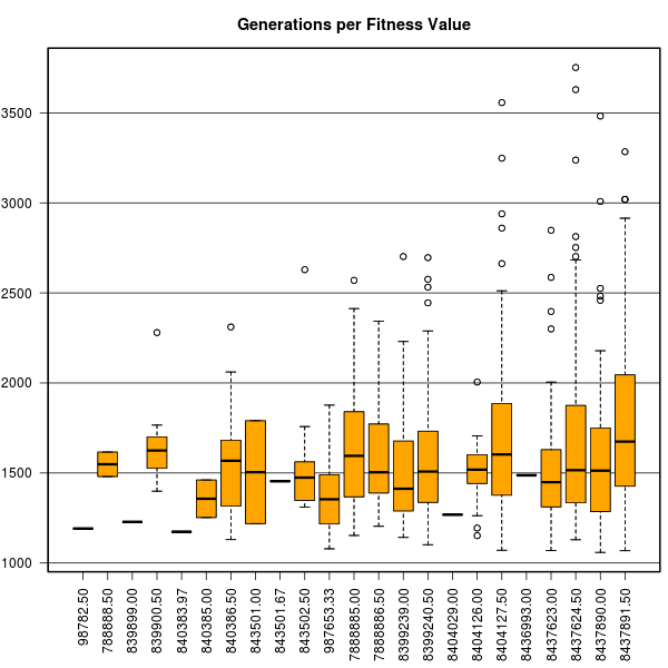 includes the fitness values, the number of generations and the winning string.BoxPlot