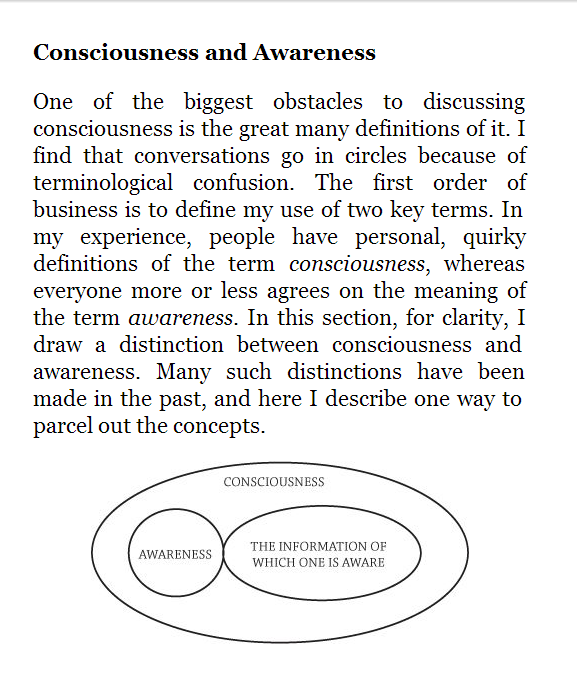 I’m always leery of the word “consciousness.” This hesitation comes from the ambiguity of the word itself. It’s a linguistic concern. The word has so many definitions that it can impede communication. Different people have radically different notions of what I’m talking about when I use that word. Many (but by no means all) people use “consciousness” and “awareness” synonymously. But “awareness” is a better word for me because it has fewer meanings. It’s clear that there is a person (or other entity) X, there is a thing Y, and X is aware of Y, in the sense of having a mental possession of, or a subjective experience, of, Y. Whatever you call that, awareness or consciousness, this is what I am working on.