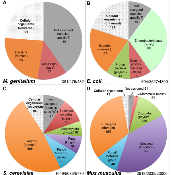 ETA: There’s something very wrong with how these pie charts were made. The note says that E coli had 300+ essential genes, but the figure shows 600+. From the analysis I made it should be 300+. I think that the pie chart is misleading because the figure should not be a pie chart, since that assumes that the total genes is the sum of what’s in the pie, but enterobacteria are gammaproteobacteria, which means that the total number of essential genes is over-counted.