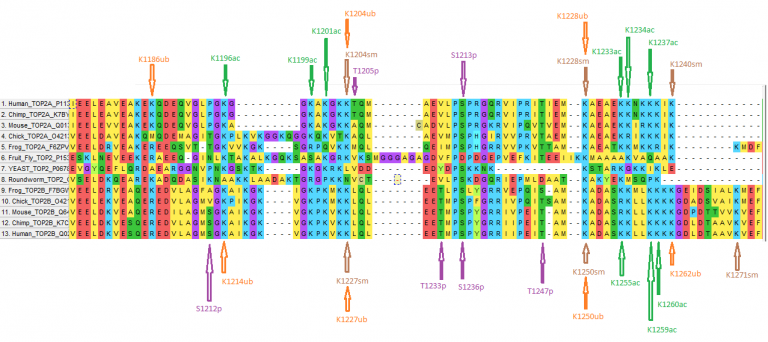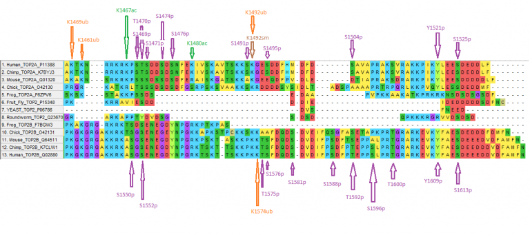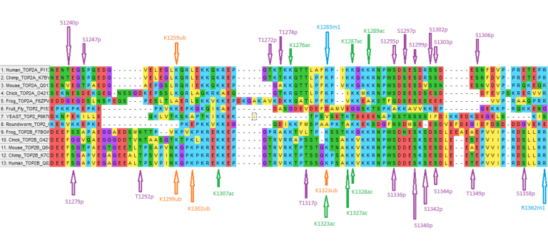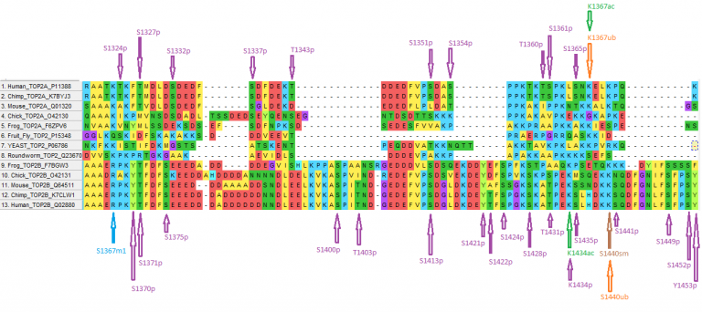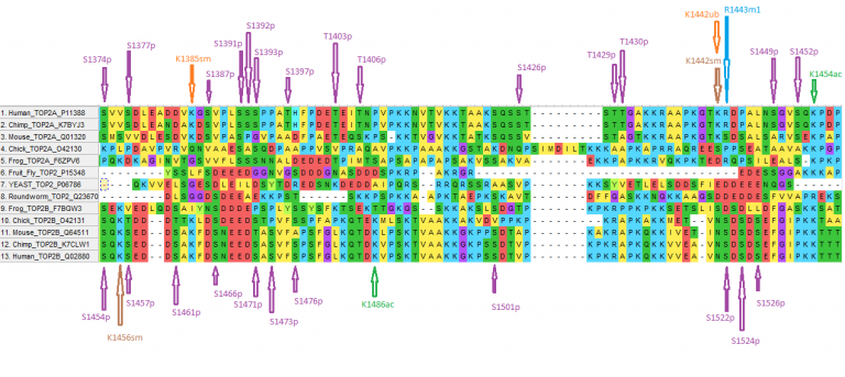 Continuing from the previous comment, here is the next adjacent segment on Top2A and Top2B. Again, the PTMs are obviously different on the parlogs, not to mention, in principle must be different on the other species. Note some of the specialized PTMs on Top2A like the 1st degree methylation on Argenine (R1443m1).