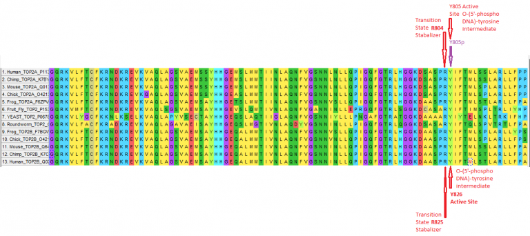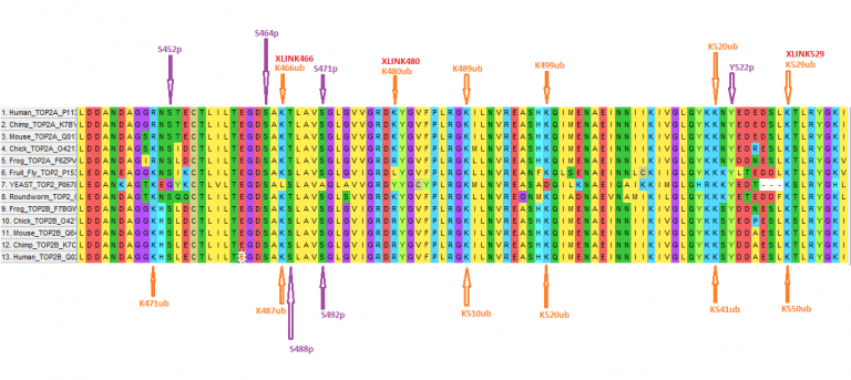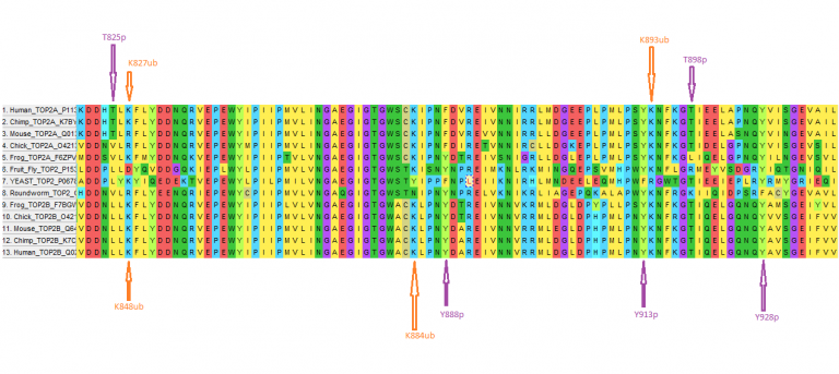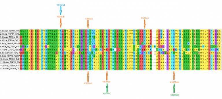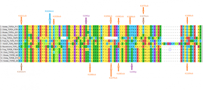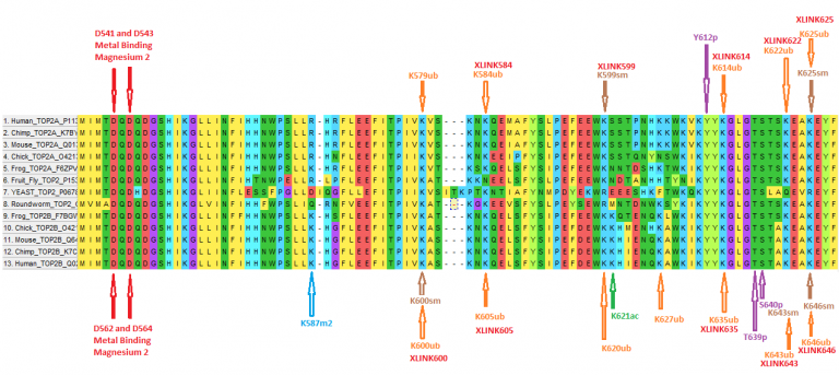 Here is the next adjacent segment of the Top2 proteins. I’ve learned a lot in the process of gathering this information and have had some thoughts about promiscuous motifs in biology as I surveyed the target addresses of PTM motifs.