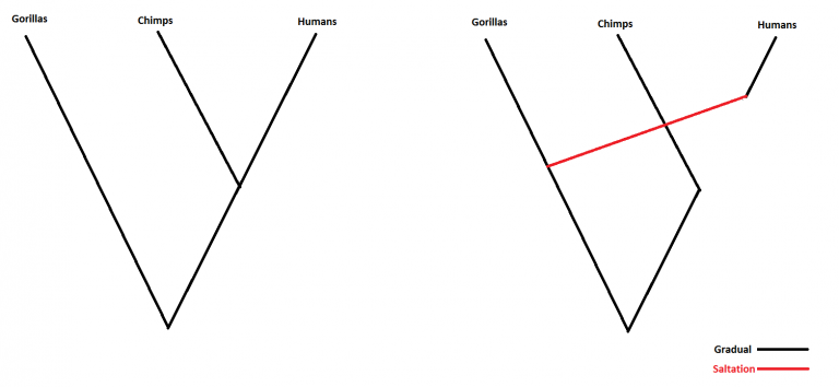 Here’s a graph where I try to show that, if one doesn’t assume gradual change, phylogenetic evidence can’t support humans share a more recent common ancestor with chimps than gorillas. Something similar could be done with every other node of the tree
